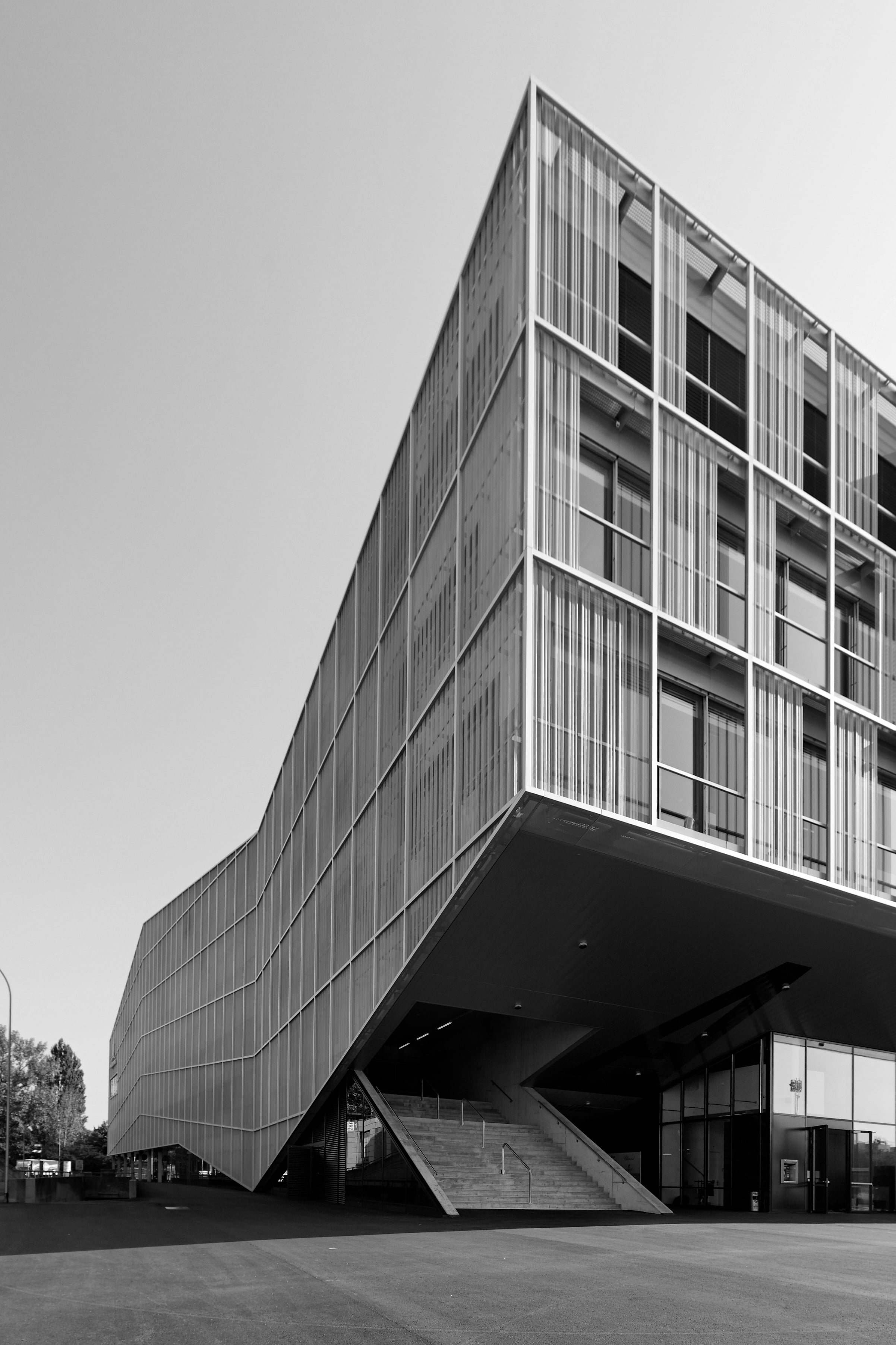 Der untere Teil des Gebäudes berührt das Terrain hier und da; in den Ecken ist es hochgezogen, mit Rampen für die Eingänge zur Arena. Die leichte Art wie das Gebäude die Umgebung «ertastet», und wie die Form orthogonal zum Grundriss geknickt ist, ergibt eine Dynamik und das Gefühl von Leichtigkeit und Bewegung, so dass das grosse Gebäude leicht über dem Gelände zu schweben scheint.