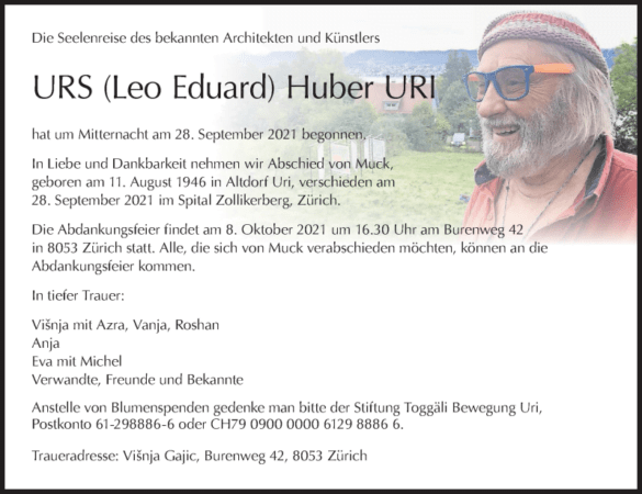 Von Lukas Vogelsang – Er hat seinen Artikel in der letzten ensuite-Ausgabe nicht mehr lesen können. Im Juli 2021 kam Urs Huber Uri zu uns in die Redaktion und wollte eine Anzeige schalten. Es wäre an der Zeit, dass man ihn finde — ihn und seine Geschichten. Es folgte ein kurzer, aber intensiver Austausch, er suchte uns zweimal im Büro auf — Lukas Vogelsang besuchte Urs am 9. September 2021 am Burenweg 42 in Zürich und schrieb anschliessend einen Artikel für die Oktoberausgabe. Am 6. Oktober hörten wir durch Zufall, dass Urs am 28. September überraschend gestorben sei. Immerhin: Wir haben Urs und seine Geschichten noch gefunden, aber noch viel zu wenig verstanden. Er ist jetzt weitergereist. Ob ihn ein Ufo mitgenommen hat? Es wäre spannend zu wissen, was er jetzt weiss. Hier also eine Art Nachruf – der eigentlich keiner ist …