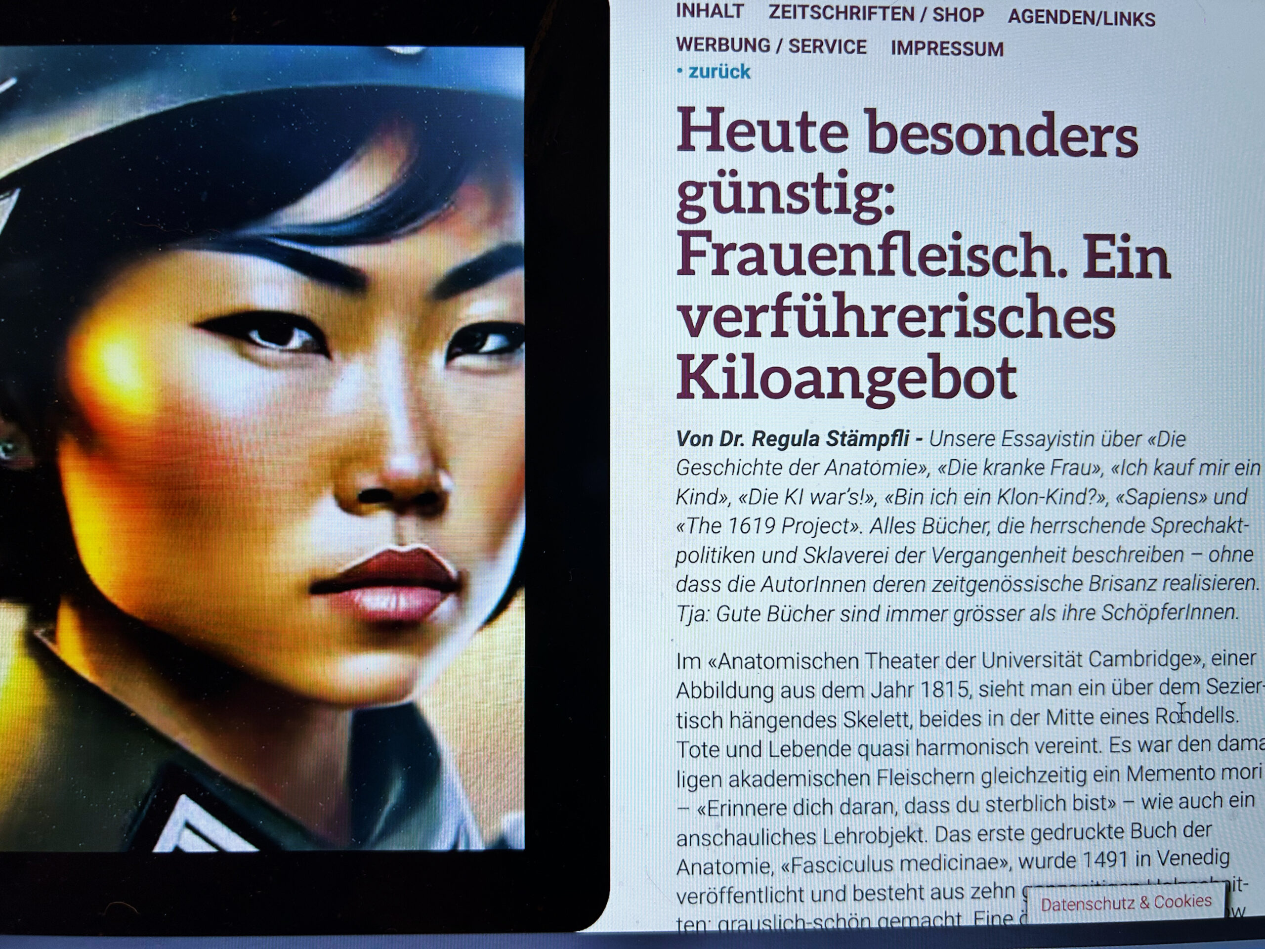 Heute besonders günstig: Frauenfleisch. Ein verführerisches Kiloangebot. Ich liebe diesen Essay im ENSUITE – es geht um Gemini und dessen woke Programmierung, die auf die Frage nach einem SS-Soldaten 1943 diese sexy Asiatin in Naziuniform zeigt. KI bleibt unverstanden. Sie ist nicht Intelligenz, doch Wissenstool von unerreichbaren Datensätzen, die sich die Welt so imaginieren, wie die gefütterten Daten dies gestalten. Seit Jahren ist meine Warnung nicht, dass Menschen wie Maschinen werden, sondern sich die Menschen wie Maschinen benehmen, sich deren Datensätzen anpassen und aufgrund codierter Narrativen die Welt gestalten. Im Mai war meine letzte Hannah-Arendt-Lecture, die ich an der HSG initiiert habe – Israel, Grossbritannien und die USA warten schon auf die gleichnamige Serie im nächsten Jahr. Die NZZ am Sonntag berichtete am 23.6. 2024 über «Nvidia» als «wertvollstes Unternehmen der Welt», eine Firma, die mit KI viel mehr kann als Halbleiter herstellen, in einem Schweizer Forschungszentrum, wo mehr als 200 Personen arbeiten. Leider wurde das Thema nicht weiterverfolgt, wie so oft in den Medien heutzutage. So hören wir nichts davon, dass Microsoft eventuell eine Nuklearanlage für die KI plant oder auch Chat GPT. Eine Anfrage auf Chat GPT kostet fünfmal soviel wie eine Anfrage auf Google – elektrotechnisch gesprochen. Wir bleiben dran: Computing und Simulation bleiben für laStaempfli als Expertin für die Bertelsmann-Stiftung aktuell.