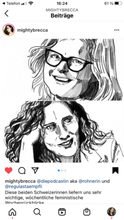 Dank Isabel Rohner und #DiePodcastin erfah­re ich Sinnlichkeit, Neugierde, Lebenslust, Entdeckungseuphorie, Unsichtbarkeit und weib­li­che Solidarität wie ein neu­ge­won­nes Feministinnenleben. Es gilt zu zele­brie­ren: Die Podcasts von Frauen, die Onlineseiten von #50JahreFrauenstimmrecht, #CH2021 die gros­se Zita Küng, #HerStory, #daser­ste­mal, #kom­po­ni­stin­nen (von Susanne Wosnitzka), das neue Buch der genia­len Hedwig Richter, die gros­se Luise F. Pusch, #Frauenzaehlen, #ProQuote , die Malisa-Stiftung von Maria Furtwängler und Lisa Burda, alle Posts von Inge Bell; ach, es gibt nicht genü­gend Platz, um ihnen allen zu hul­di­gen. Thea, der Blog zu „Frauen in Sprache, Medien und Gesellschaft“ will ich hier extra erwäh­nen. Dann ihr #erstesMal und #nach­ge­zaehlt sind wie fembio.org Fundgruben für Grundlagenwissen von, für Frauen und Diverse.