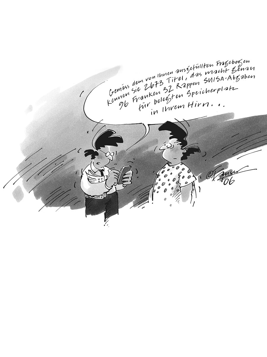 Alles klar? Investieren Sie demnach in hard ware, wenn Sie die angekündigten Gebühren ganz legal umgehen wollen. Oder gönnen Sie sich ein neues Handy, das Ihnen den mp3-Player ersetzt. Stillschweigend, ohne grosses Trara. So scheitert der ohnehin unbeholfene Versuch, die unkontrollierbare, rechtliche Grauzone des Upund Download zur Kasse zu bitten. Die Abgabe, das ist richtig, trifft die Falschen.
