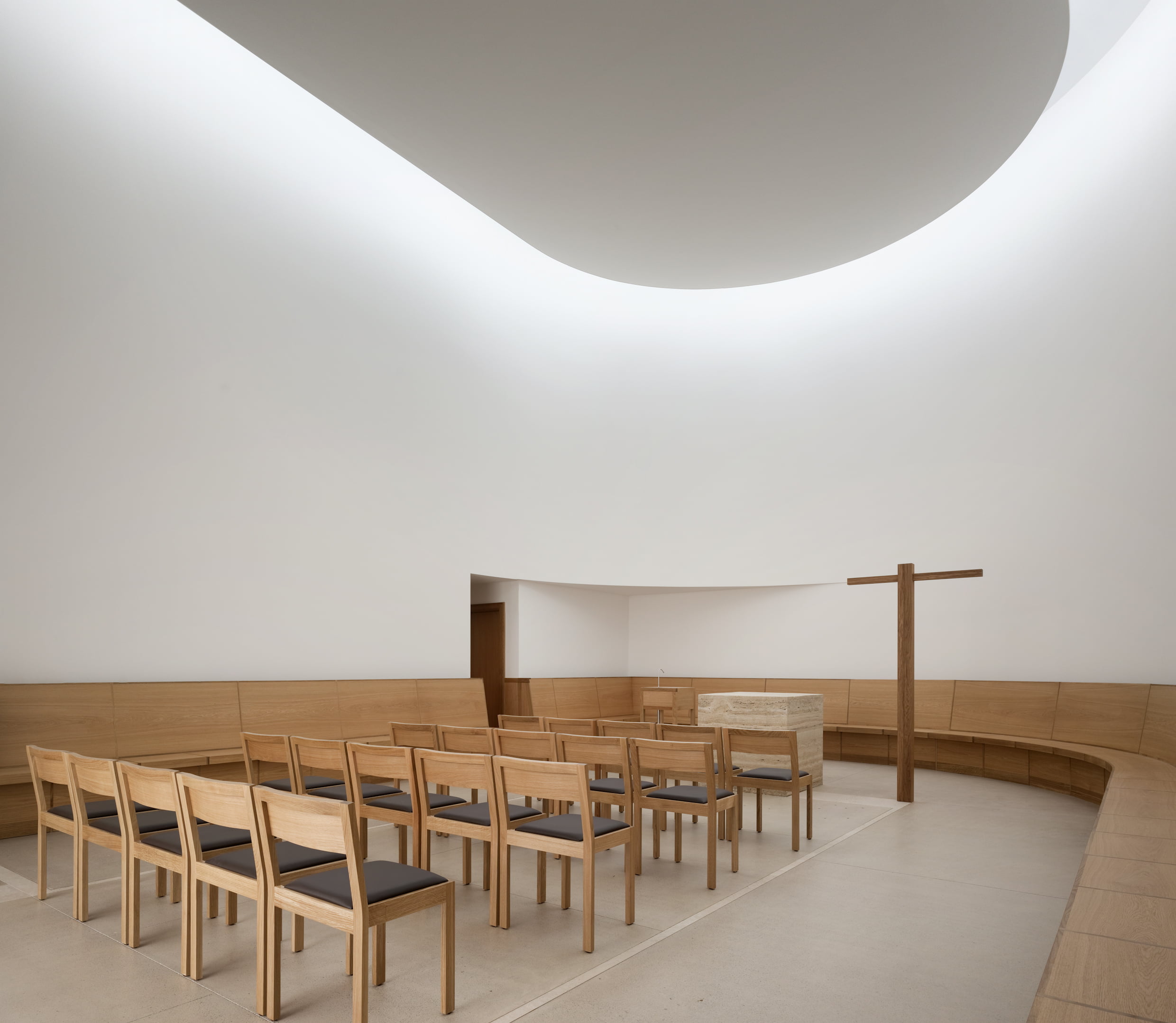 Ob ein Ort oder Raum spi­ri­tu­ell ist, ist eine per­sön­li­che Betrachtung. Für mich ist die Stimmung in der Kapelle intim und spi­ri­tu­ell. Mit der Material-Palette und sei­nen sym­bo­li­schen Formen ergibt sich ein Ort für Gemeinschaft, für spi­ri­tu­el­les Leben und gleich­zei­tig einen Ort zum Wohnen für Familien. Es ist eine neue Verbindung aus sakra­lem und pro­fa­nem Ort zugleich.