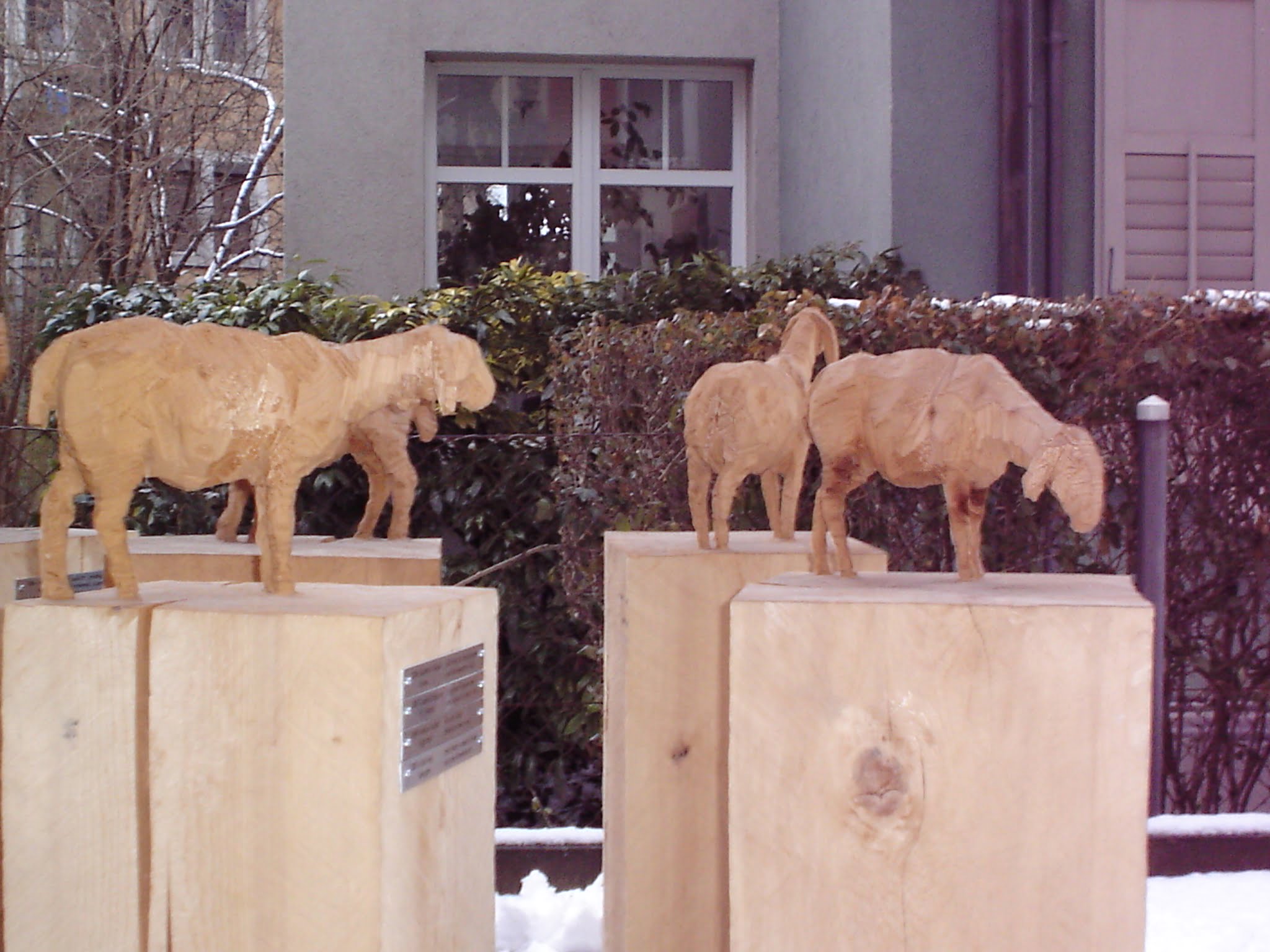 Mit sie, meint die Leiterin elf Schafe aus Holz. Zierliche Schafskulpturen aus hellem Fichtenholz, mit feingliedrigen Gliedmassen, dicken Bäuchen und furchigen Gesichtern. Skulpturen, wie sie heute oft an einer der zahllosen Künstlerperformances mit Motorsägen gemacht werden. Samt Sockel nur ungefähr fünfzig Zentimeter hoch. Aber diese fünfzig Zentimeter haben es in sich. In den fünf Jahren ihres Bestehens haben die Holzschafe des Künstlers Christian Bolt viel gesehen. St. Antönien, Klosters, Davos, St. Moritz, Trogen, Chur und nun Zürich. Ein Jahr an einem Ort, erklärt mir der Künstler Christian Bolt. Der Mann in Pullover und Überhosen ist Ende Dreissig, mit dunkelbraunem, grau meliertem Haar. Das Kommen und Gehen der Schafe hat offenbar Programm. Jeden Winter sammelt der Künstler die Schafe von ihren Besitzern ein. Dann bringt er die Skulpturen wieder an einen anderen Ort und zu anderen Menschen. Ein Jahr – das genügt, sagt Christian Bolt. Die Schafe gehören niemandem. Nicht die filigranen, perfekt proportionierten Körper, welche mit einer grossen Motorsäge gestaltet sind, machen diese Skulpturen so besonders, sondern ihre Geschichte. Auf jedem Sockel sind mehrere Plaketten aus Aluminium angebracht. Beschrieben mit jeweils einer Jahreszahl, dem Namen einer Person sowie einem kleinen Text. Das sind die Namen der ehemaligen Besitzer. Die Worte sind ein Ausdruck der Beziehung, die diese Menschen zu ihrem Schaf entwickelt haben, erläutert der Künstler die Plaketten. Manchmal tun mir die Leute fast ein bisschen Leid, wenn sie die Schafe wieder hergeben müssen. Während er das sagt, werden dem Künstler die Augen feucht. Die Plaketten fassen die Geschichten zusammen, die Schaf und Schafhalter miteinander erlebt haben und machen diese Verbindung sichtbar. Die Schafe haben sehr unterschiedliche Werdegänge. Die einen sind quer durch die ganze Schweiz gereist, andere haben die Prättigauer Talschaft kaum je verlassen. Manche Schafe standen in Schlössern von Milliardären, andere in kleinen Mietwohnungen von Strassenarbeitern. Gleich sind sie nur am Ende des Jahres wieder vereint mit der Herde. Und doch: Neben der eigenen Gestaltung haben die Namen ihrer Halter und deren Worte auf den Sockeln jedes Schaf für sich einzigartig werden lassen.