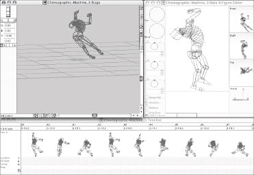 Wie funk­tio­niert Life Forms? Life Forms ist ein Choreografieprogramm, das eine detail­lier­te Bearbeitung einer Figur erlaubt. Es bie­tet hier­für in sei­ner letz­ten Version eine drei­fa­che «Werkstatt» (Editors) an. Die eine bil­det die Figur auf einer unbe­weg­ten Zeitachse, mit belie­big vie­len Bildern pro Sekunde, ab. Eine ande­re ist eine ana­to­mi­sche Werkbank. Sie spannt die Figur eines gewähl­ten Bildes, eines Moments also, in ein drei­di­men­sio­na­les Koordinatensystem. Dort bie­tet die Werkbank aller­hand chir­ur­gisch genaue Eingriffe. Die drit­te stellt die Figur auf ein gigan­ti­sches Schachbrett, die Bühne. Dort kommt zu Tage, wie raum­grei­fend ihre Bewegung ist. Zu Beginn wäh­len wir ein Modell aus einer ange­bo­te­nen Palette wie beim Vortanzen: «Moderner Tänzer A», wie Adam. In wel­cher Werkstatt auch immer wir an ihm ope­rie­ren, jeder Einschnitt gra­viert sich tief ein und ist in der ande­ren Werkstatt bereits Faktum. Haben wir ihm ver­se­hent­lich den Fuss hin­ters Ohr gesetzt (die Figur wehrt sich nicht durch das gering­ste Signal), steht er so bereits im Rampenlicht. Hatten wir Adam noch eine Sekunde zuvor beschei­den mit geneig­tem Haupt in einen Rahmen der Zeitachse gefasst, so wird er bis zum näch­sten Moment halt ein Bein für uns aus­reis­sen. Und sei­ne Wucht dabei bleibt uns nicht erspart: Die Zeitachse setzt sich auf Befehl in Bewegung, und wir sehen Adam… – Aber was wer­den wir gewahr? Mühelos fliegt das Bein hoch, kein Ausweichen im Rumpf, kei­ne Rachegelüste der Kreatur gegen den Schöpfer. Das Wesen ist nicht nur see­len­los (Animation hin oder her), es ist auch schwe­re­los. Es for­dert nicht, dass unter sei­nem Gravitationszentrum, zumin­dest hin und wie­der, ein stüt­zen­des Körperglied her muss. So haben wir im Nu eine Folge von Positionen kre­iert, die Adam nie ver­bin­den kann, es sei denn in der Schwebe. Und genau das macht er. Das Programm bie­tet uns zwar höf­lich an, man­che Posen zu erden. Aber wir haben es schon längst auf­ge­ge­ben, orga­ni­sche Formen zu schaf­fen. Das ist es auch nicht, was Choreografen inter­es­siert. Sie brau­chen kei­ne Veranschaulichung ihrer Ideen. Die kann ihr bewe­gungs­ge­schul­tes «Personal» blitz­schnell aus Andeutungen schon able­sen. Es ist viel­mehr das Durchkreuzen ihrer Ideen, was Choreografen wie Merce Cunningham, Gregor McWayne oder Pablo Ventura inter­es­siert. Alle sind sich einig: Eingefahrenen Bewegungsmustern ist am Besten durch zufalls­ar­ti­ge Durchmischung ein Schnippchen zu schla­gen. Aus die­sem Grunde hol­te Merce vor fünf­zig Jahren schon den Würfel her­vor. Er zer­glie­der­te die bekann­ten Positionen des Balletts und wür­fel­te, wel­cher Arm zu wel­chem Bein posie­ren durf­te. Indem er mit Life Forms gan­ze Bibliotheken an Posen sam­meln konn­te, ver­viel­fäl­tig­ten sich die Kombinationen und pro­fes­sio­na­li­sier­te sich der Zufall. Der Computer ist – bei ent­spre­chen­den Befehlen – der per­fek­te Zufallsgenerator!