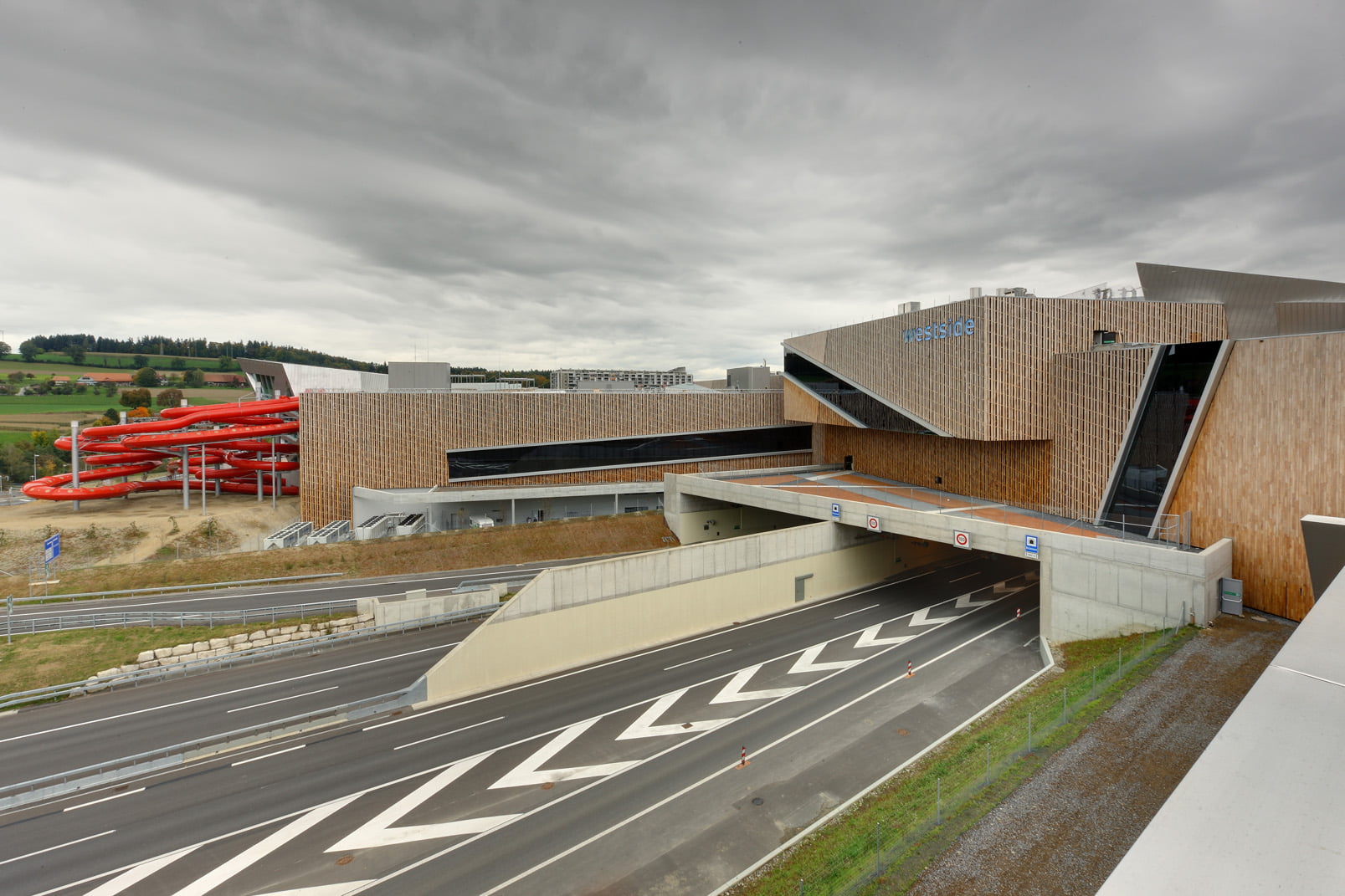 Im Gegensatz zu den meisten Einkaufszentren bietet Westside einen guten Zugang – auch ohne Auto. Statt durch Auto-Landschaften zu schlendern, geht man über einen offenen Platz in eine dreieckige Eingangsöffnung hinein. Als Haupteingang des gesamten Komplexes ist dieser allerdings nicht so kraftvoll, wie man dies erwarten würde. Er ist nicht grosszügig genug. Einmal drin, nimmt man den luftigen, hochkomplexen und fragmentierten Innenraum wahr. Das Interieur ist dynamisch: Es gibt kaum einen rechten Winkel zu sehen, alles bewegt sich, Stützen und Träger sind schräg. Die verglasten Leuchtkästen wirken wie künstliche Kristalle, filtern Tageslicht durch das weisse strukturelle Netz; es tut gut, Tageslicht zu spüren. Auch die künstliche Beleuchtung ist im Konzept integriert, die Streifen der Fluoreszenzlichter sind zufällig auf die Decken verstreut. Eine starke Dynamik ergibt sich auch durch die diagonalen, ineinander verschachtelten Rolltreppen, welche die Besucher hoch und runter transportieren. Der Effekt der schrägen Geometrie erinnert an Räume eines Science-Fiction-Films. Der Innenraum des Gebäudes ist besonders fotogen, vor allem das Schwimmbad wirkt phantastisch. Wie verschobene Platten sind die schrägen Wände im Zickzack mit weissen Treppenbalustraden verziert, die hoch zu den Rutschbahnen führen und die Dreidimensionalität der Räume vergrössern. Die geneigten Wände der Bäder erzeugen dreieckige, trichterförmige Räume. Wie die roten Rutschbahnen viszeral aus dem Gebäude herausragen, ist lustig, und neben der Autobahn gleich wieder eine gelungene architektonische Werbung für das Angebot des Zentrums.